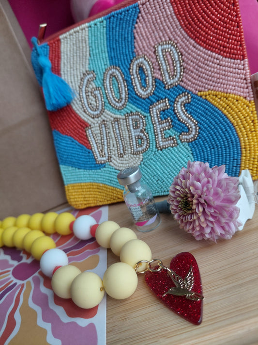 Collier Pop Love jaune et sa pochette Good Vibes